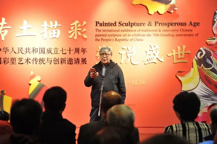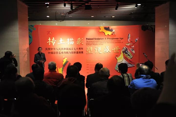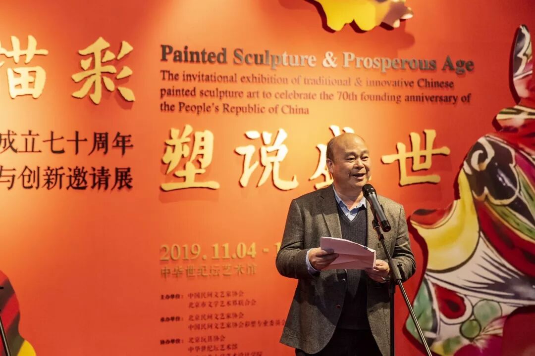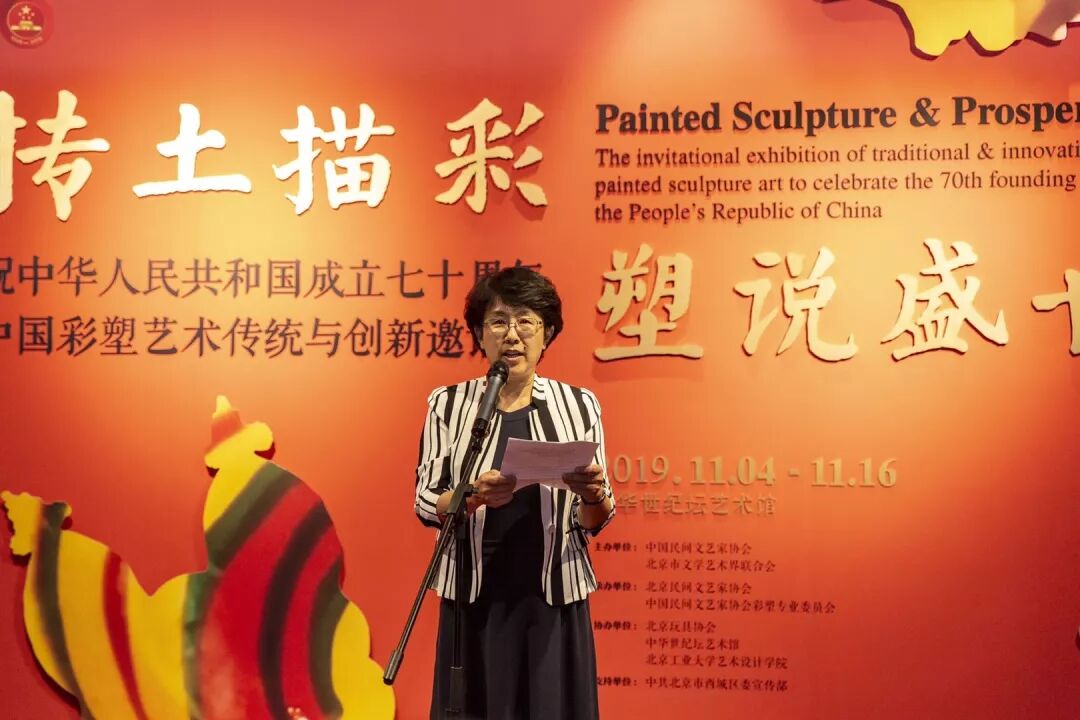 由中国民间文艺家协会、北京市文学艺术界联合会主办,北京民间文艺家协会、中国民间文艺家协会彩塑专业委员会承办的“抟土描彩•塑说盛世——庆祝中华人民共和国成立七十周年中国彩塑艺术传统与创新邀请展”于2019年11月4日下午14:00在中华世纪坛正式拉开帷幕。中国民间文艺家协会分党组书记、驻会副主席邱运华、北京市文学艺术界联合会党组书记、常务副主席陈宁、北京民间文艺家协会主席赵世瑜、清华大学美术学院教授张錩、北京师范大学教授刘铁梁、北京工业大学艺术设计学院院长邹锋、北京联合大学艺术学院院长张旗、中国文联民间文艺艺术中心主任徐岫鹃等领导专家参加了开幕式。